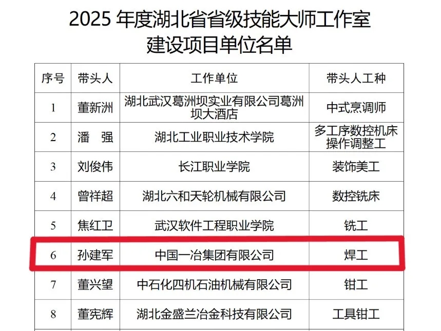 近日,湖北省人力资源和社会保障厅公布了2025年省级技能大师工作室建设项目名单,中国一冶钢构公司孙建军技能大师工作室成功入选。