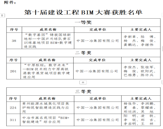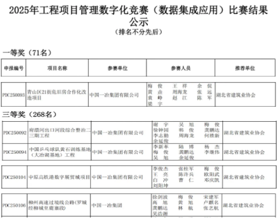 近日,中国建筑业协会公布2025年工程项目管理数字化竞赛和第十届建设工程BIM大赛结果,中国一冶在BIM大赛中斩获一等奖1项、二等奖1项、三等奖2项;在数字化竞赛中斩获一等奖1项、三等奖4项。