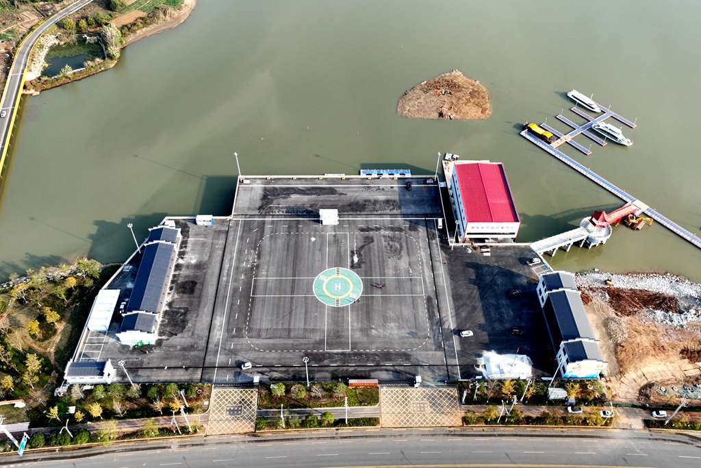 该项目地处湖北省黄石市大冶湖北岸,紧邻园博园、园博大道和奥体大道。项目总面积为18413平方米,设计年货物吞吐量为10000吨。整个码头功能分区科学合理,涵盖了指挥调度区、货运码头区、物资储备兼临时休息区、救援船码头区以及船舶维修区。码头共设有4个物资运输船泊位和40个抢险救援船泊位,具备强大的综合货运与应急保障能力。自项目开工以来,项目部优化施工组织,科学统筹规划,动态调整施工方案,采用“多点开花、平行作业”的施工模式,将码头区、储备区等不同功能区同步推进,最大化利用作业面,减少工序衔接等待时间。