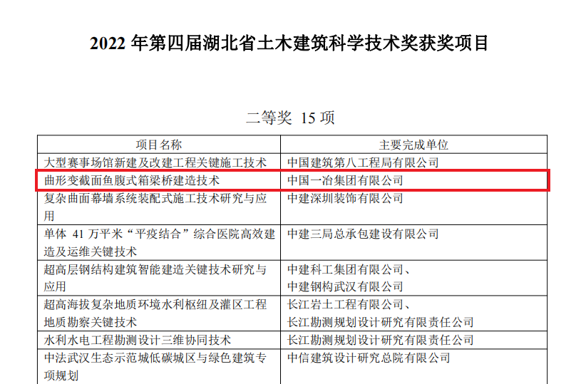 2月1日,中国一冶深圳公司主持完成的科技成果“曲形变截面鱼腹式箱梁桥建造技术”荣获第四届湖北省土木建筑科学技术奖二等奖。