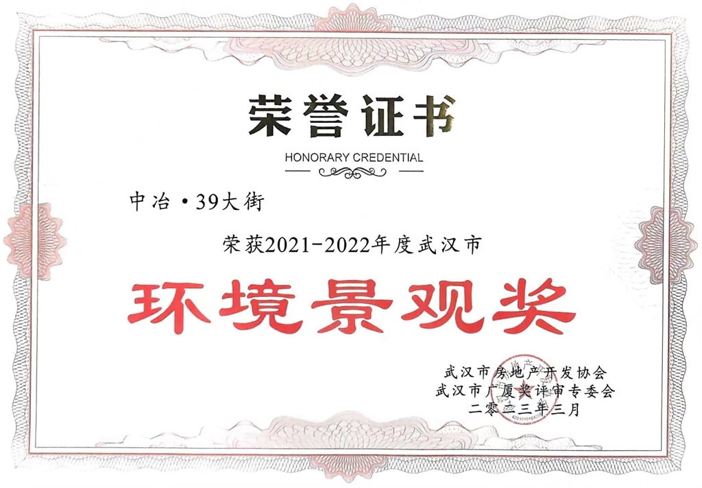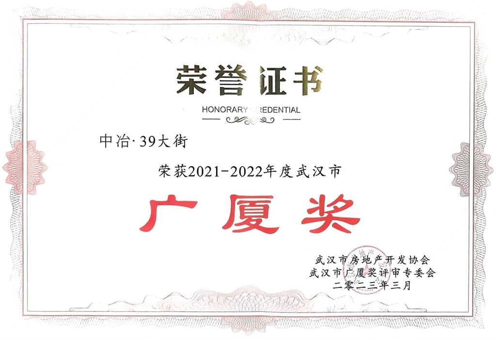 “广厦奖”是经国家批准的房地产行业综合性奖项,代表房地产综合开发行业的最高荣誉,被誉为中国地产界的“奥斯卡”。2021-2022年度武汉市广厦奖评选活动共有70余个项目进行了申报,参评项目必须做到规划设计水平高、环境质量好、工程质量优,并在推进住宅产业化、“四节一环保”和解决广大群众住房问题方面起到示范带动作用。经过武汉市房地产开发协会专家组初审及现场考评等环节,最终武汉置业中冶·39大街项目荣获“武汉广厦奖”和“环境景观奖”。