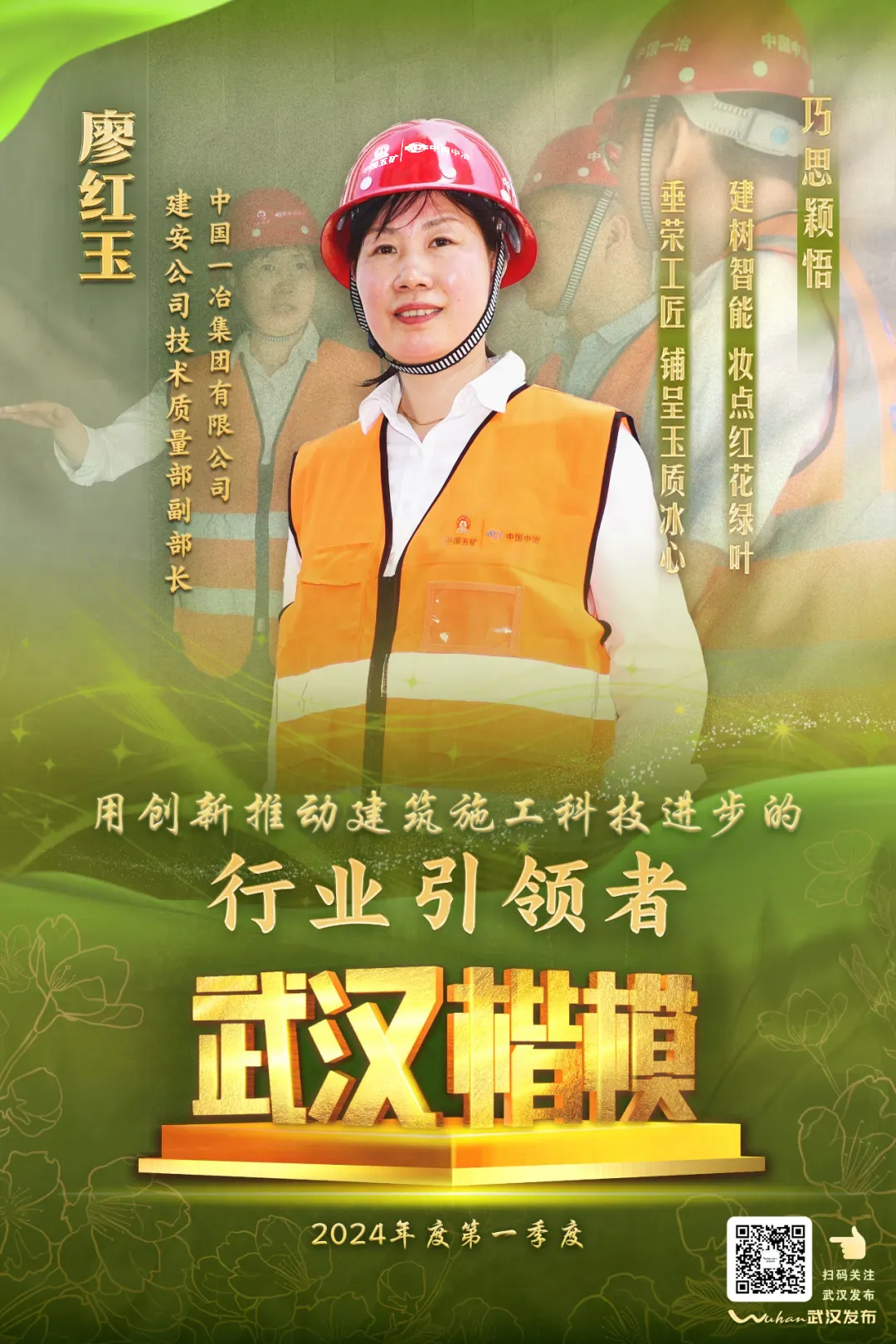 4月23日,武汉市委宣传部发布2024年第一季度“武汉楷模”榜单,中国一冶职工廖红玉入选。