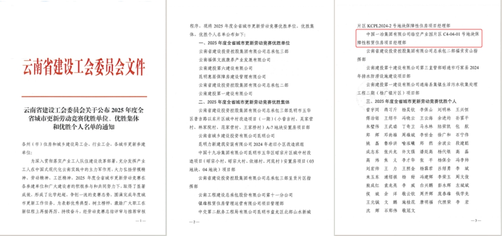 1月12日,由中国一冶交通分公司承建的云南临空产业园片区C4-04-01号地块保障性租赁住房项目获得云南省建设工会委员会“2025年度全省城市更新劳动竞赛”优胜集体荣誉。