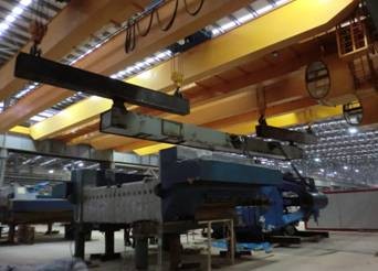 广西南南铝加工铝合金热轧工程有两台拉伸机设备,分别为30MN拉伸矫直机和100MN拉伸矫直机。其中30MN拉伸机安装于热轧厂房CD跨14~19线,该跨行车为两台50吨和两台32吨,30MN拉伸矫直机设备总重775吨,设备到货均为散装到货,但最大件重150吨,厂房屋面最低处高度12.2米,且设备基础在厂房正中,不能满足大型液压吊车站位、伸杆的要求。集团南南铝项目部通过精密计算分析后决定,采用4台行车抬吊,吊装时4台车靠拢,2台32吨行车和2台50吨行车分别抬吊一根短吊具,短吊具下设吊点连接长吊具,长吊具上设吊点与设备连接,采用4台行车同时实施吊装。
