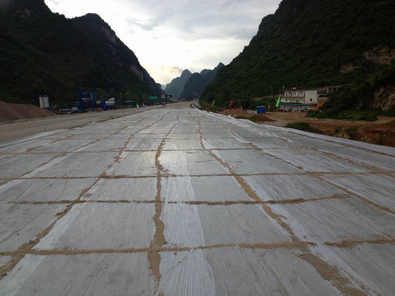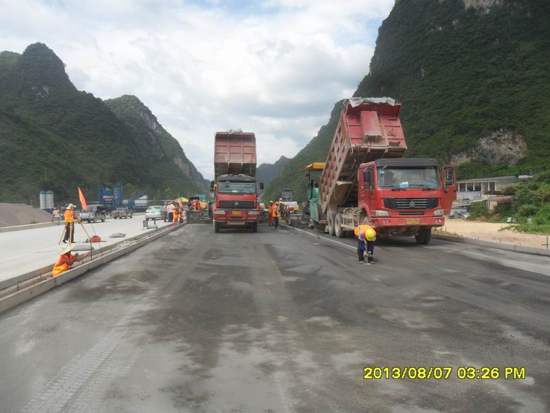 百靖高速公路路面水泥稳定碎石基层(简称水稳基层)设计厚度为33厘米,施工中将水稳基层分厚17厘米下基层和16厘米上基层分层摊铺。此次摊铺的水稳层最后一个试验段为厚16厘米的水稳上基层试验段,摊铺路段的起讫桩号为:K59+860至K60+120(右幅),全长240米,摊铺厚度约16厘米,宽度约11.8厘米,松铺系数为1.26。