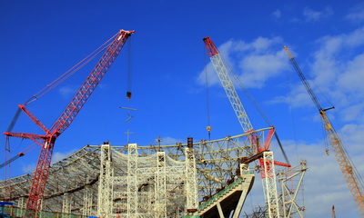 集团机械化公司负责该项目的吊、安装工作,16台履带式起重机参与施工,吊车员工分成日夜两班在场馆内、外同时进行安装作业。提前四天安全、高效的完成了主体育场上部结构封顶,得到甲方的高度赞扬。