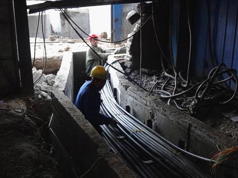本次敷设的高压电缆为电炉和精炼炉3台主变压器35千伏电源,8根高压电缆共计3.8公里。从110千伏总降变至变压器高压室每根高压电缆近500米,该电缆敷设过程中要穿过地下电缆隧道、空中电缆通廊、吊车梁下电缆桥架、室内电缆沟,施工难度较大,项目部共计投入作业人员400人,计划3天敷设完成。