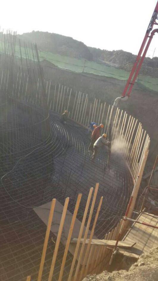 该基础埋深-7.650米,直径26米,最大壁厚0.51米,砼1040立方米。为了保证砼的成型质量,项目部决定采取一次性浇筑。一次性浇筑施工难度较大,特别是支模的难度,项目部技术、质量部门多次召开专题会,反复对方案进行斟酌。施工前对作业班组进行交底,让作业班组理解支模要点和注意事项,同时质检员现场跟班监督指导作业队的施工,保证了筒壁模板的安装质量。