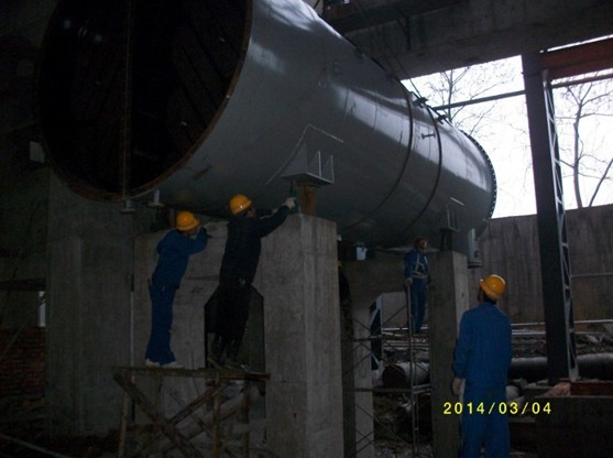 冷凝器于3月2日下午到达现场,由于现场路况复杂,运输车辆超宽超长,不能直接将冷凝器运抵汽机房,项目部只有通过换车倒运,连夜加班将设备进场卸车。冷凝器长9米、直径3.5米,重30吨,需安装在汽轮机基础下部,利用行车无法直接吊装到位。此前定的方案是利用一台50吨液压吊和行车将之从汽机房的侧面送入安装位置。而今根据现场情形,这种吊装方法除去吊机台班还要对吊机站位的场地进行平整,时间长而且成本高。面对困境,架工师傅利用汽机岛上的混凝土梁作为临时吊点进行冷凝器的旋转和缓钩,巧妙地把冷凝器送入汽机基础下,顺利将冷凝器吊装到位。