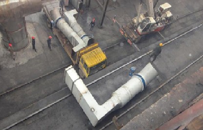 项目部组织施工人员提前做好准备,将管件和吊车准备到位。检修时间到达后,经过焦化厂现场监督人员确认停下四大车电源,组织两台25吨吊车进入熄焦车轨道区域,同时吊装三段汇合管。虽然时间紧迫,但施工人员都在各自的岗位上有序的做着手头的工作,项目部技术人员在焦侧熄焦车轨道起吊区域和炉顶安装区域细心检查,保证每个步骤的安全可靠。