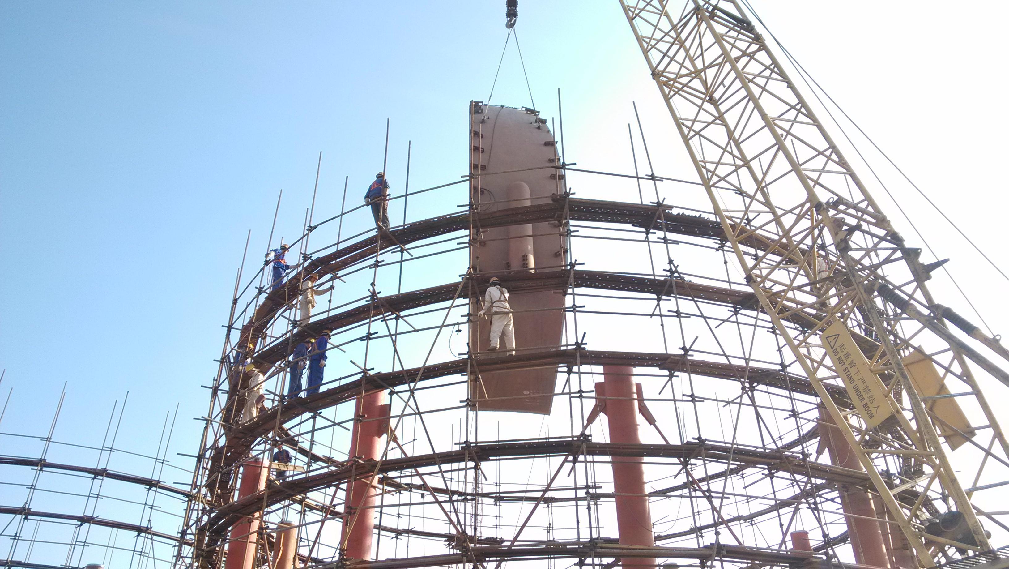 该工程位于浙江省市平湖市乍浦镇嘉兴港区兴兴新能源公司现场,年产30万吨聚乙烯和39万吨丙烯工程共有6台低温-50℃丙烯球罐安装,是集团钢构公司第一次承建的低温球罐,也是第一次与洛阳设计院合作的项目,干好本项目工程,为下一个阶段的投标再次奠定营销基础。集团钢构压力容器分公司安装项目部全体工作人员,积极开展吊装前的技术交底,安全施工、用电、设备等准备工作,终于在6日清晨,开启了3000立方米丙烯球罐安装的新征程。