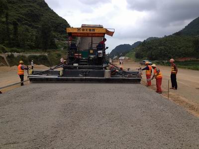 此次水稳底基层摊铺施工路段为:K63+744—K65+070段左幅,全长1326米,宽度约13米,设计厚度为20厘米,松铺系数为1.3。8月23日,此段水稳底基层摊铺施工正式开始。尽管在摊铺施工中受雨天、水稳拌合站电机故障、停电及运料道路封堵等不利因素的影响,但在项目管理人员及施工作业人员的共同努力下,经过数日的抢干、巧干,9月2日晚,此段1326米的水稳底基层摊铺施工终于全部顺利完成。
