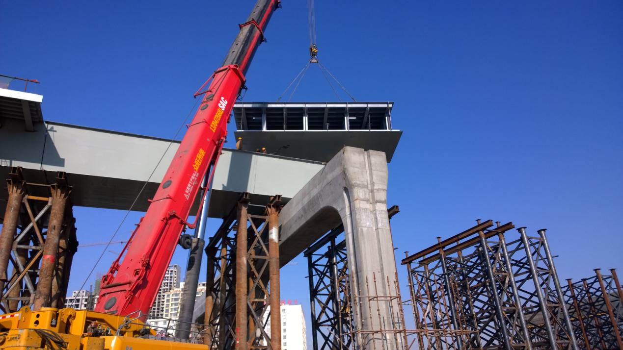 11月22日,呼和浩特市南二环钢箱梁制作和安装工程安装现场再次启动吊装工作,一共6个节段,总长度33.5米,重量248吨,贯通了15号和16号墩柱,顺利吊装至路口段。
