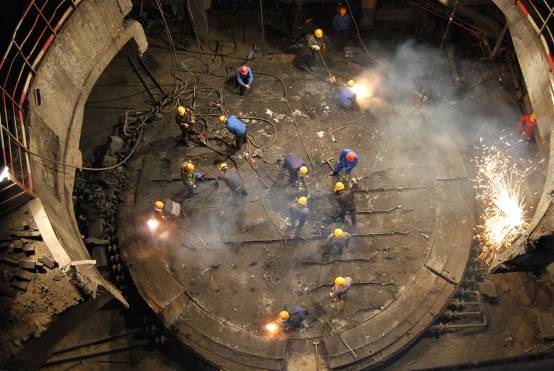 12月8日,拆除施工进入最后攻坚阶段,虽然高炉本体拆除仅剩下四带半,但也是最艰难、最艰巨的四带半,大量炉料、残铁、碳砖、耐材在高温环境中熔化、半熔化在一起形成了坚硬的整体,拆除起来十分困难,为了确保安全、加快施工进度,施工人员首先将外层炉壳一点点切开,然后用千斤顶、倒链、行车将炉壳、水冷壁同坚硬的炉内物体分离,并吊离高炉本体,使工业炉得以快速将炉料、碳砖、耐材等清除下来。在工安、工业炉相互支持和相互配合下,14日清晨,重达200吨的残铁展现在了大家的眼前,过去处理残铁都需要用吹氧管将其切割成小块后才能吊离现场,不仅费时费力,而且效率低不经济。在炉体降温时盘状残铁产生了一些裂纹,项目部决定使用炮机分解残铁,仅用两个半小时就将巨大的盘状残铁分解成了七、八块,接着朱玉东工段20多名员工连午饭都顾不上吃,一鼓作气将每个重达数十吨的八块残铁顺利地拖下了炉基,并连夜将炉底冷却系统拆除。