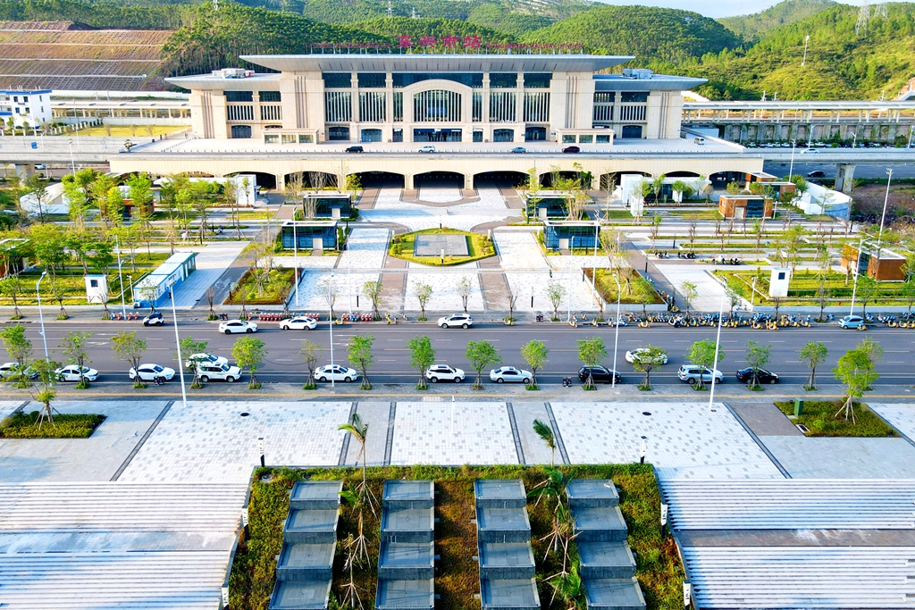 该项目位于广西东兴市黄桥村附近,总用地面积34554平方米,总建筑面积16692平方米,包含2个站前广场、8条配套路网和进站高架桥,主要建设内容包括路基路面工程、给排水工程、照明工程、园林绿化工程、附属工程、消防工程等。其中,配套路网道路总长约4.2千米,设计时速20千米。进站高架桥为预应力混凝土现浇箱梁桥,总长约822米,宽度9-15米,两侧桥梁引道宽9米,站前平台段宽15米,桥面按单向双车道设计,设计时速20千米。项目的建成完善了车站功能,为各种机动车辆提供行驶、停放的场地和地下换乘空间,同时也能满足旅客安全、迅速集散的要求,对东兴市打造交通运输一体化具有重要的意义。
