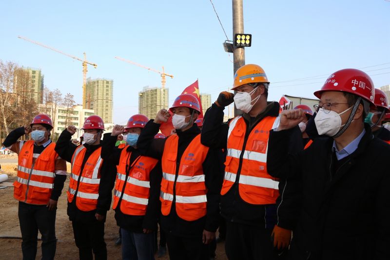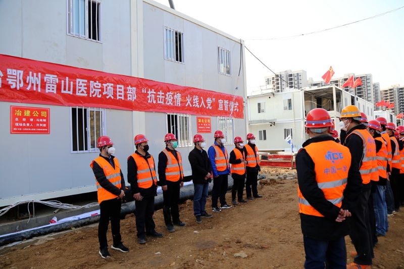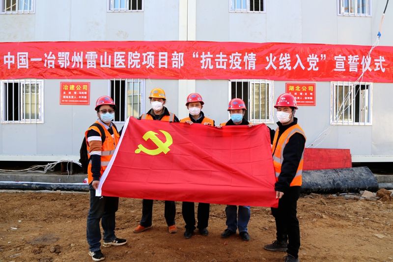 “我志愿加入中国共产党……随时准备为党和人民牺牲一切……”2月13日,中国一冶集团杨炳阳等5名入党积极分子在鄂州雷山医院建设现场举拳宣誓,光荣入党。集团总经理、党委副书记汪诚及一线党员代表面对鲜红党旗,一同重温入党誓词,立下总攻军令状。
