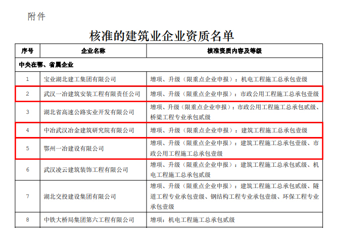 12月7日,湖北省住房和城乡建设厅公布了新一批核准的建筑业企业资质名单,中国一冶多家子企业资质提档升级。鄂州一冶取得建筑工程施工总承包壹级、市政公用工程施工总承包壹级资质,建安公司取得市政公用工程施工总承包壹级资质,武建院取得建筑工程施工总承包壹级资质。此前,钢构公司也取得建筑工程施工总承包壹级、市政公用工程施工总承包壹级资质。