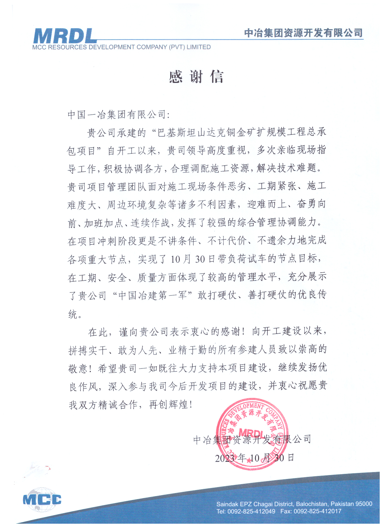 10月30日,由中冶铜锌投资、中国恩菲设计、中国一冶承建的巴基斯坦山达克铜金矿扩规模项目带负荷联动试车成功。