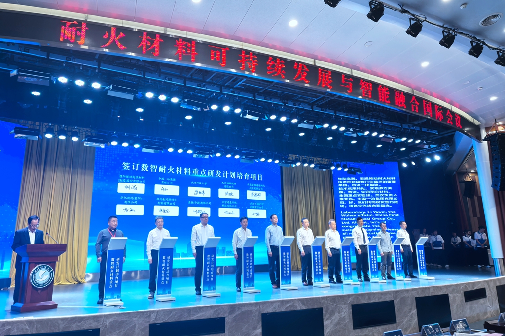 会议开幕式上,全球首个数智耐火材料工程中心揭牌。该中心依托先进耐火全国重点实验室(武汉)建设,将为耐火材料的智能化转型提供重要的平台支撑,助力行业打破技术壁垒,加速科技成果转化,推动产业向数字化、智能化、绿色化迈进。会议现场,武汉科技大学与中国一冶等9家头部企业代表签署首批“数智耐火材料重点研发计划培育项目”。